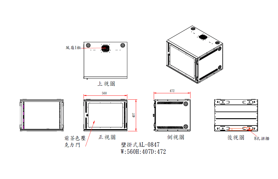 ◎ 標準配件:主柱. 前壓克力門加鎖. 電源排插. 散熱風扇. 面板螺絲. 掛壁組件
