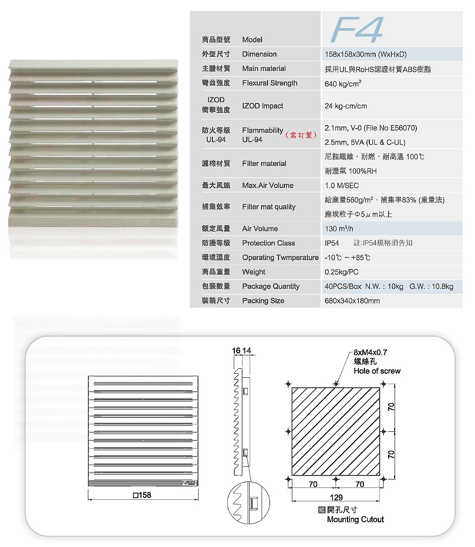 核心優勢在於高效能與耐用度的結合。風扇具備 3000 RPM 高轉速與 120 CFM 強勁風量,搭配補集效率達 80% 的專用濾網組,能提供 130m3/h 的額定風量。滾珠軸承確保了低噪音與長壽命,且抗紫外線外框與合成纖維濾棉可有效防止環境老化。