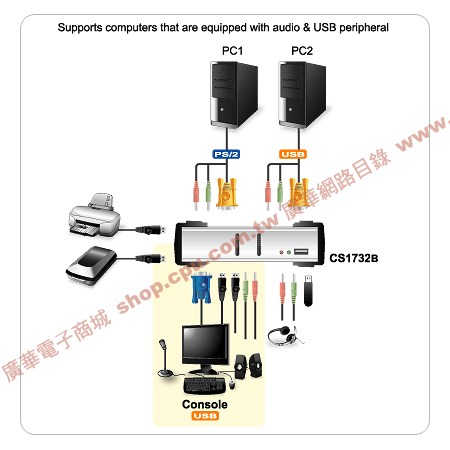 ACS-1732B 是內建2埠USB 2.0 Hub的2埠KVMP™多電腦切換器,使用者可透過一組鍵盤、螢幕及滑鼠所組成的控制端,集中管理2台電腦。使用者亦可透過前板按鈕、熱鍵及OSD三種方式輕鬆進行電腦切換。