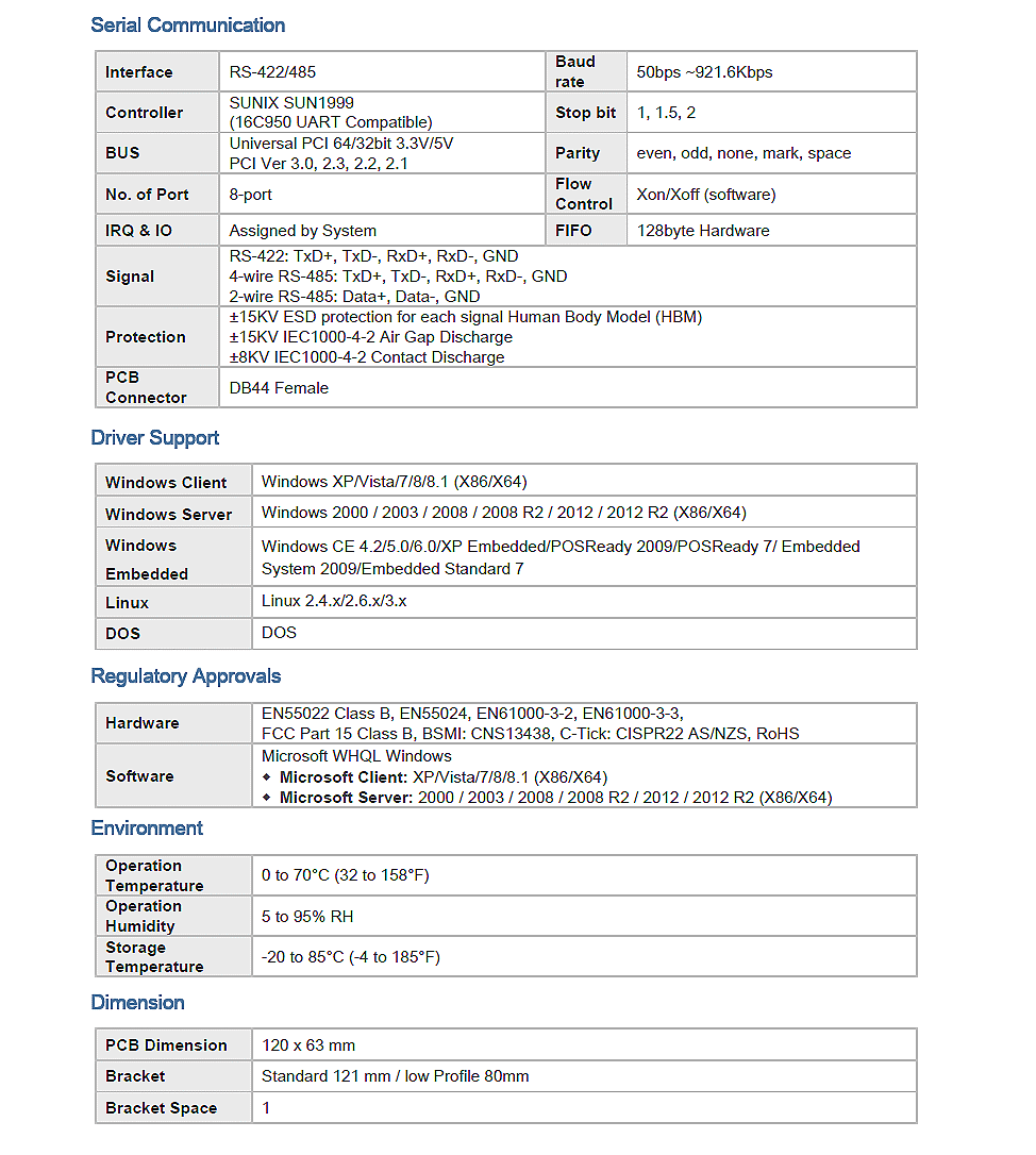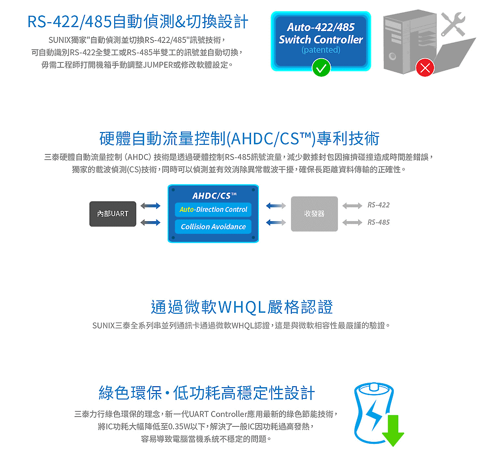 產品採用自主研發的高性能 SUN1999 單晶片,支援高達 921.6 Kbps 傳輸率與 128byte 硬體 FIFO。其最大的差異化優勢在於通過微軟 WHQL 認證,能全面支援從最新的 Windows 11、Server 2022 到 Linux 與 DOS 等多樣化作業系統。