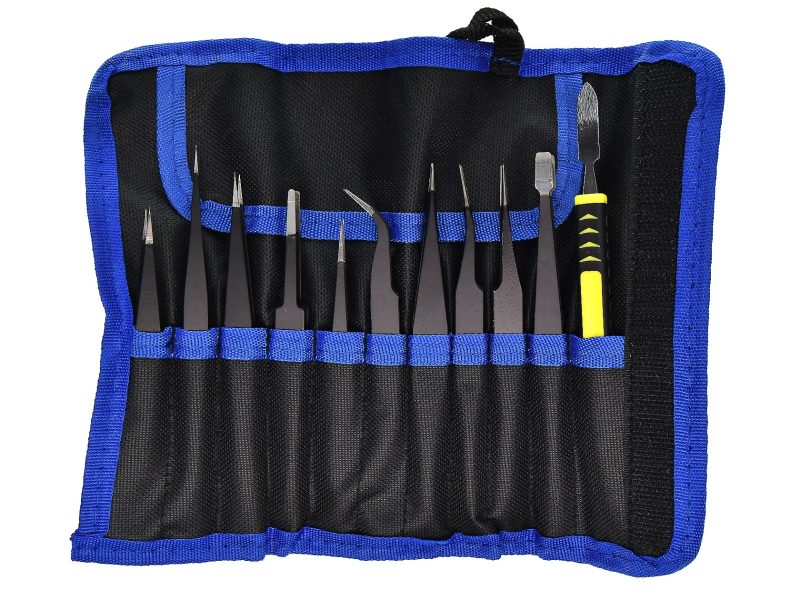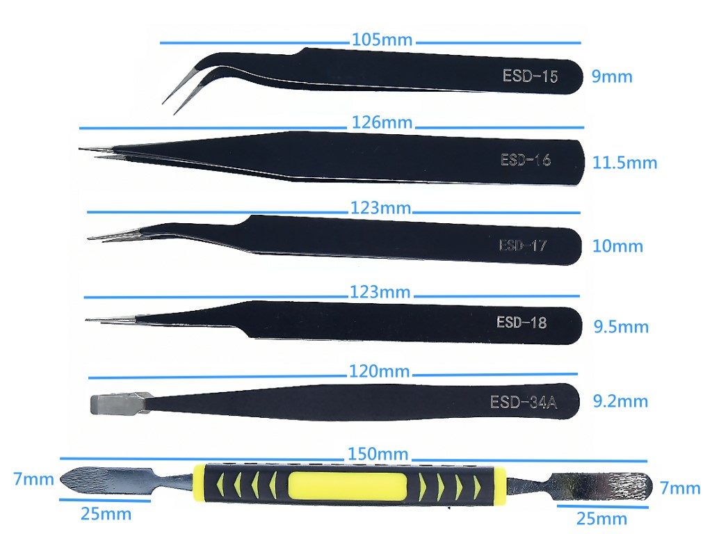 ◎ 內容物組成:10支不同規格鑷子 + 1支雙頭拆機撬棒