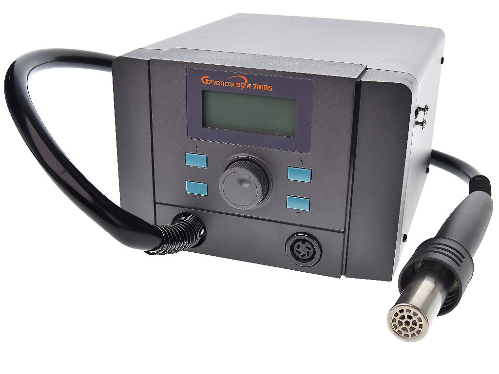 該系統整合了高功率熱風拆焊與 70W 烙鐵焊接功能,能在狹小的維修工作桌上節省大量空間。針對 SMD 封裝元件,高達 1180W 的熱風輸出可確保解焊快速且不傷電路板,是多種電子封裝元件回焊與維修的理想工作站。