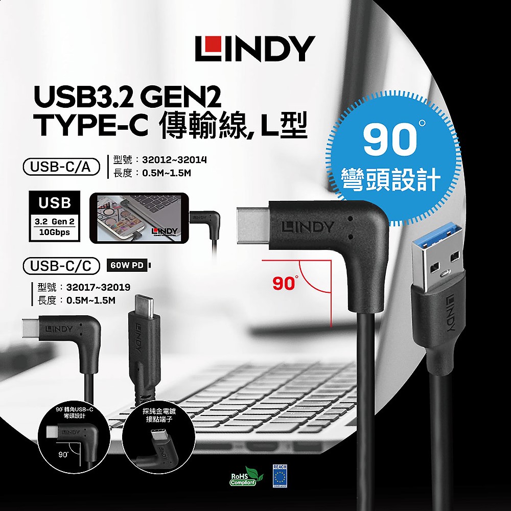 德國林帝 USB3.2 A公-Type-C公 PD60W L型傳輸線1M