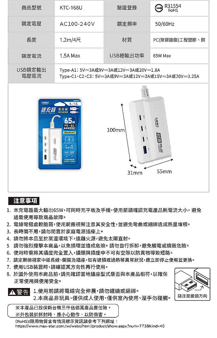 ◎ 速充寶 PD65W 氮化鎵快充延長線 / 4尺