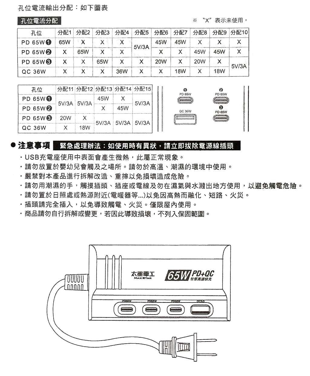 Type-C1、C2、C3: DC5V⎓3A、9V⎓3A、12V⎓3A、15V⎓3A、20V⎓3.35A
