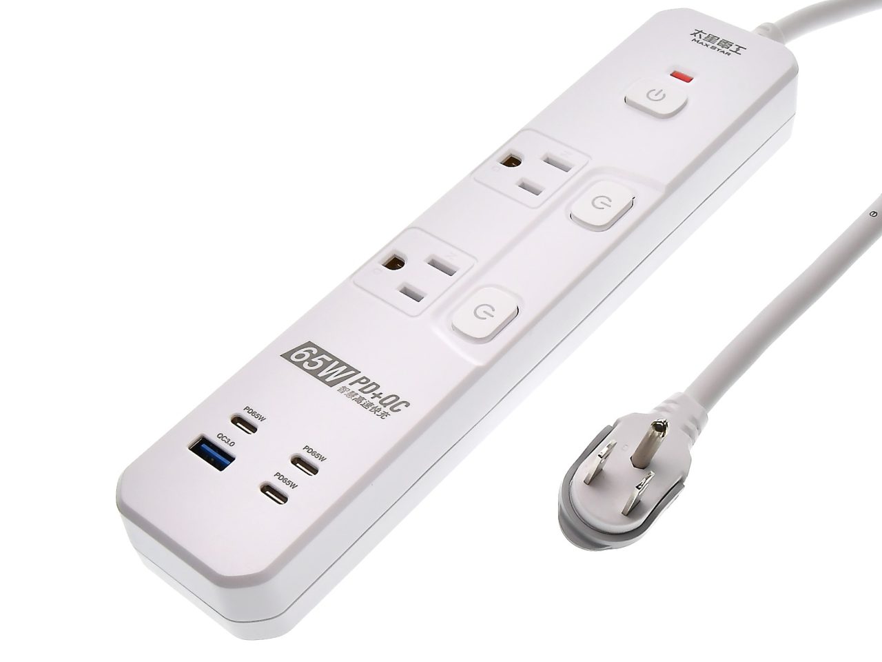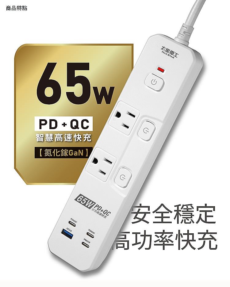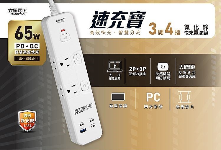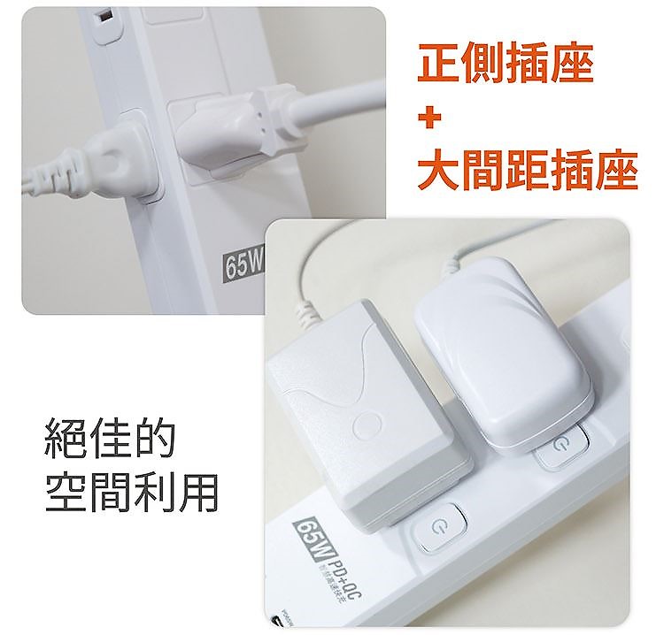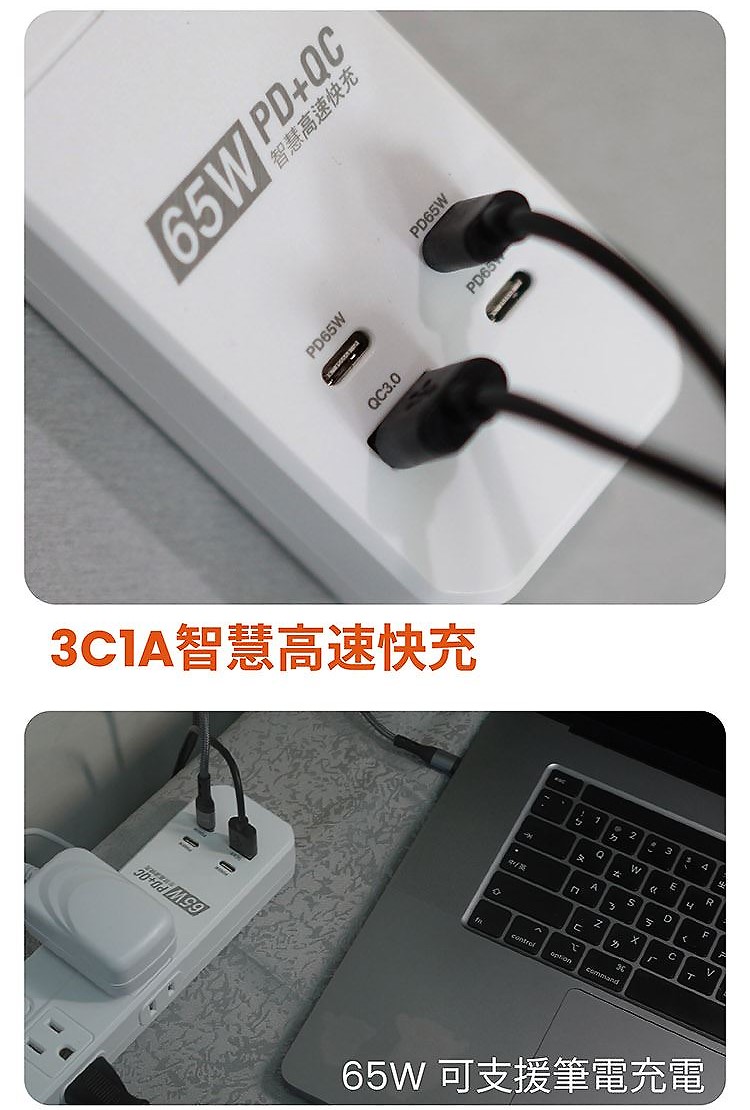 ◎ 速充寶 PD65W 氮化鎵三開四插快充電腦線 / 2P+3P