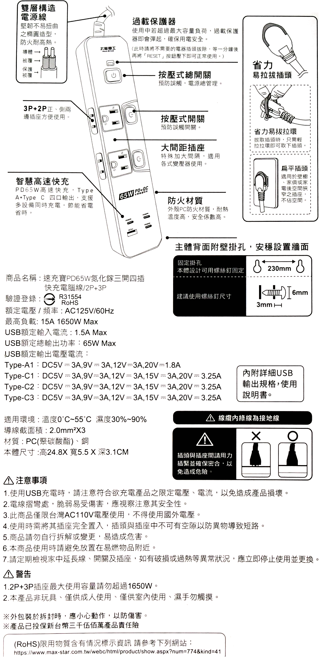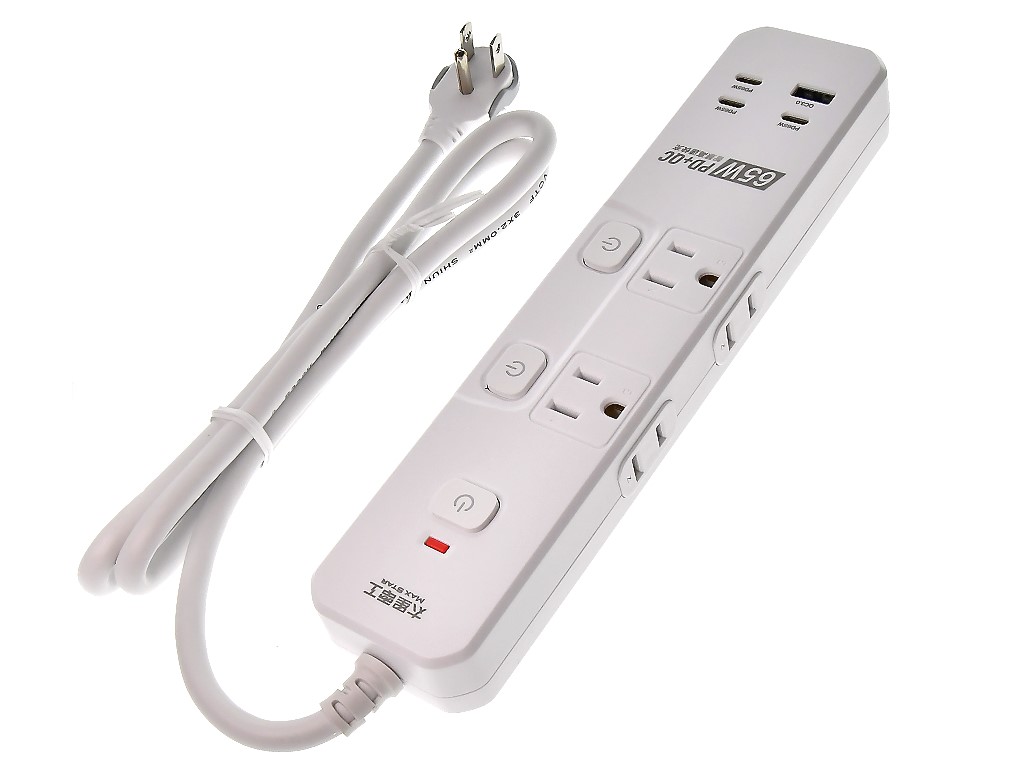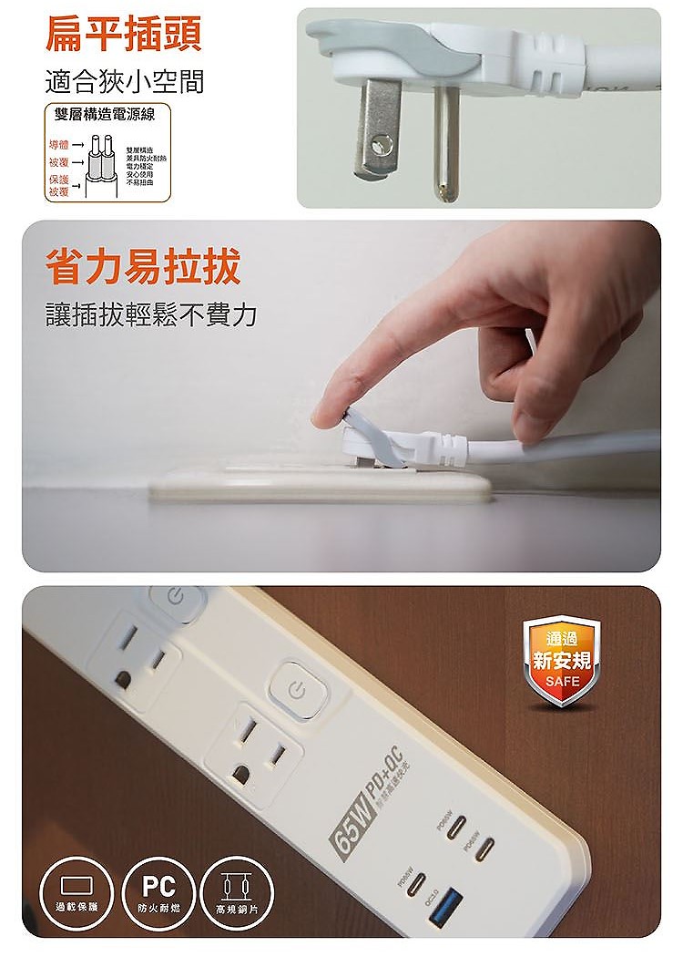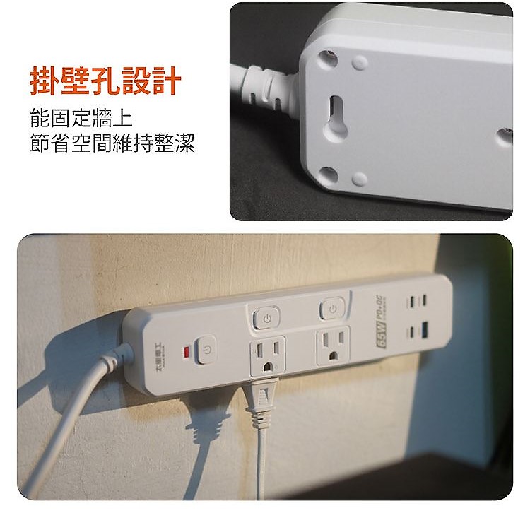 ◎ 速充寶 PD65W 氮化鎵三開四插快充電腦線 / 2P+3P