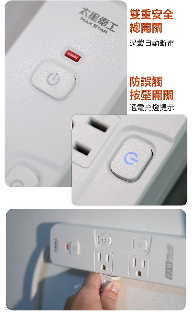 ◎ 過載保護器:使用中若超過最大容量負荷,過載保護器即會彈起,確保用電安全