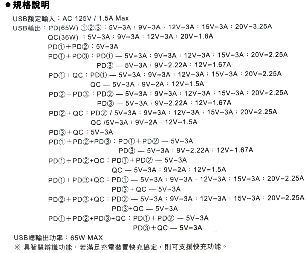 Type-C3型:DC5V⎓3A,9V⎓3A,12V⎓3A,15V⎓3A,20V⎓3.25A