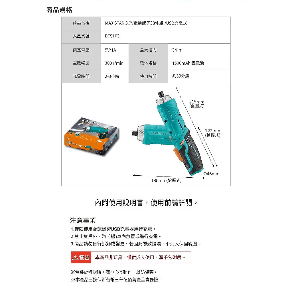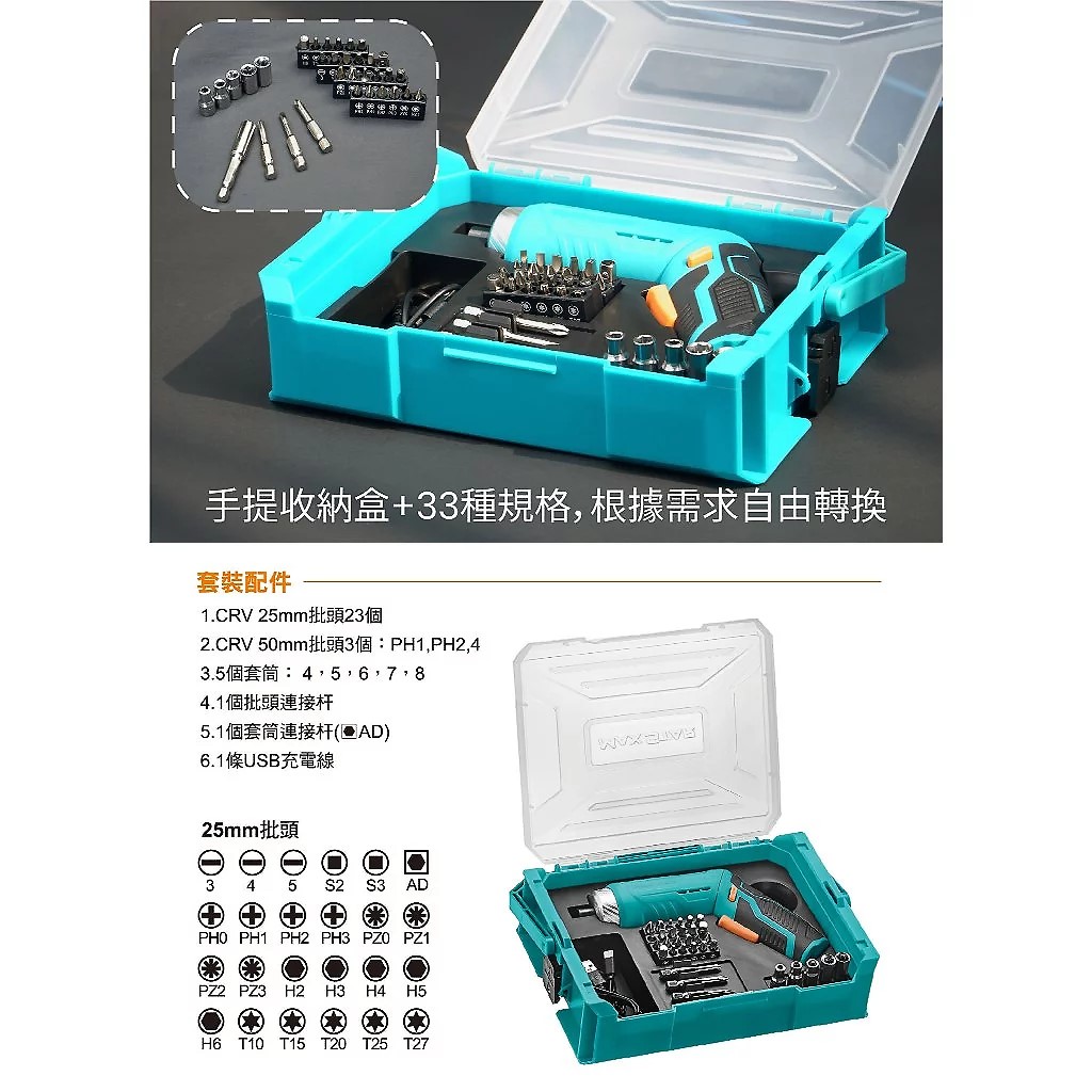 太星電工 DC3.7V 33件 USB充電式電動起子250rpm