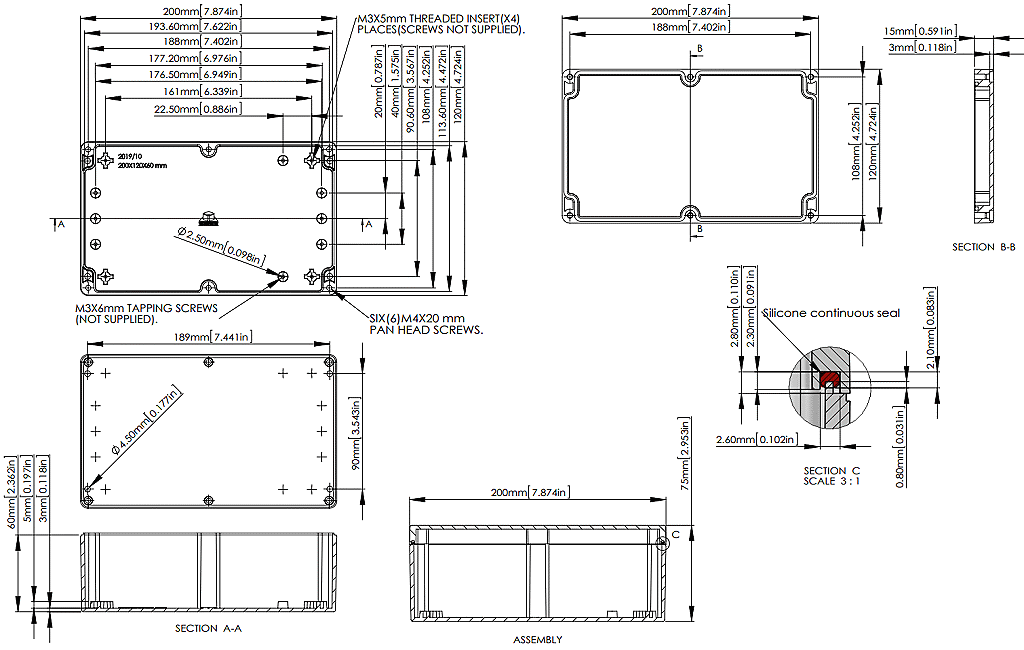 ◎ 內部底座上的凸台可以水平固定 PCB 或用 M3X4mm 自攻螺釘連接端子