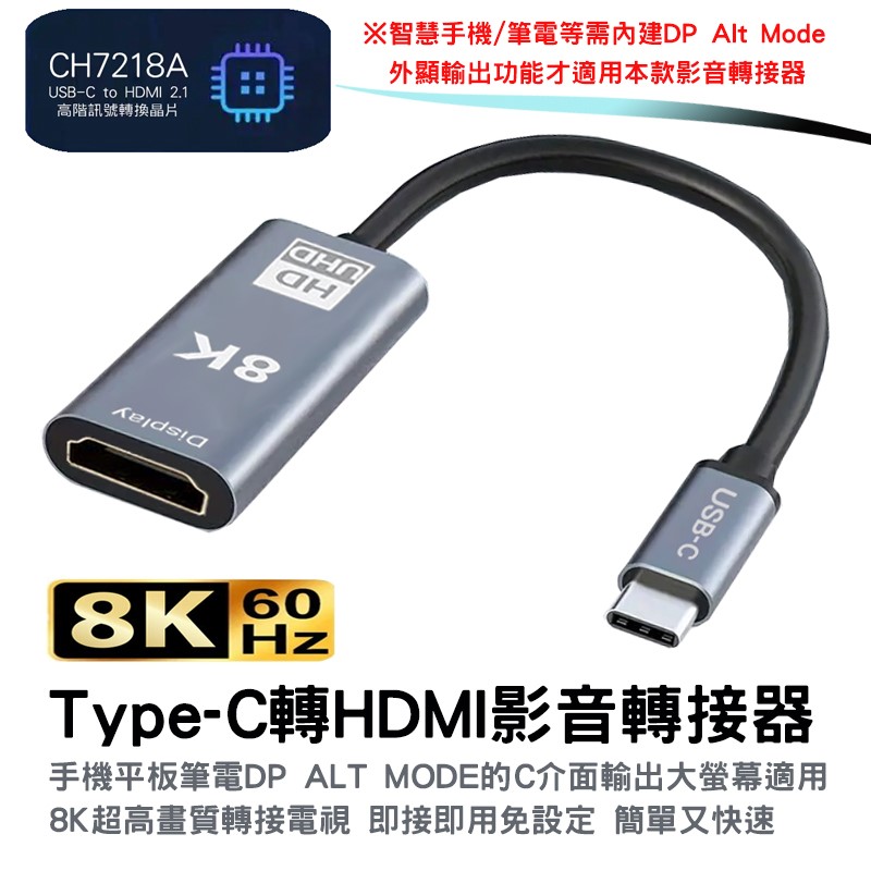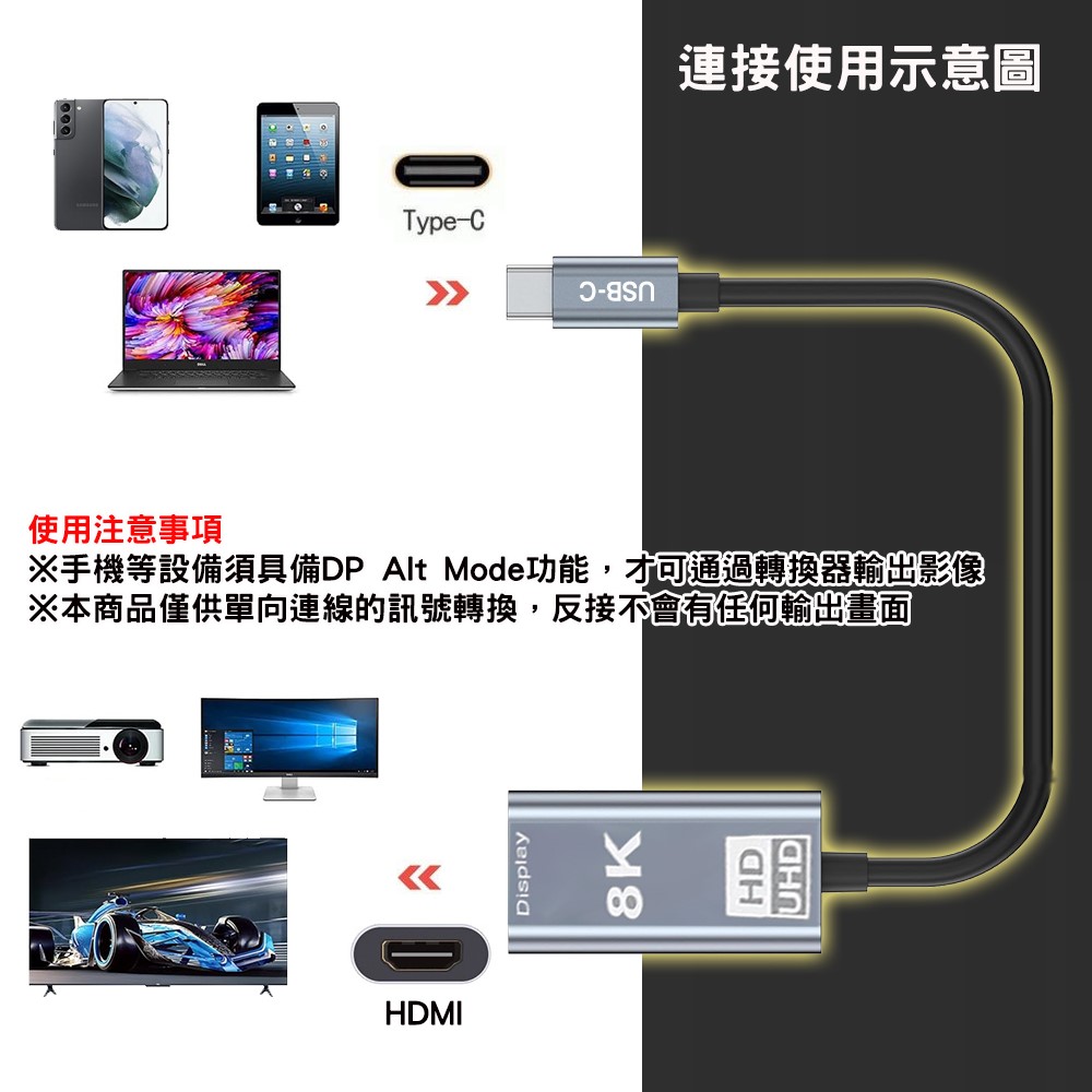 ◎ 本款 USB-C 公to HDMI 母 轉接短線乃是為了 USB Type-C 影音輸出而生,可將你的手機筆電等設備的 C介面轉為HDMI高清 8K 的外接輸出