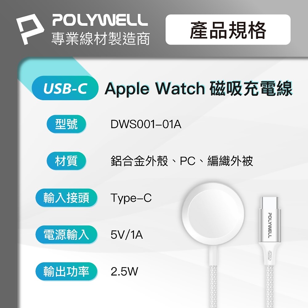POLYWELL寶利威爾 Type-C公 Apple Watch 磁吸充電盤1M
