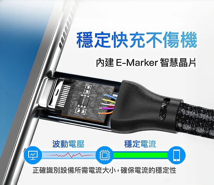 ◎ 內建 E-marker IC, 使用5A專用充電線材, 充電最大功率可達 100W (Type-C To C)