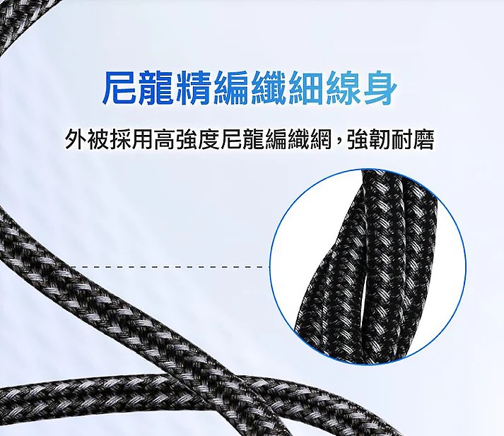 ◎ 尼龍編織外被,抗拉扯、抗磨耗 極為耐用