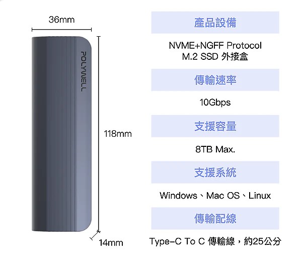 ◎ POLYWELL M.2 SSD 行動硬碟外接盒(不含硬碟)