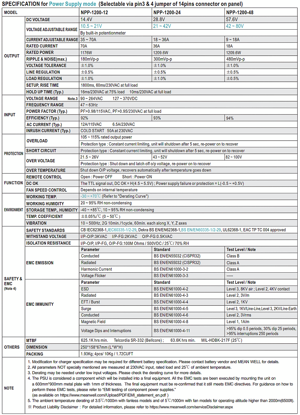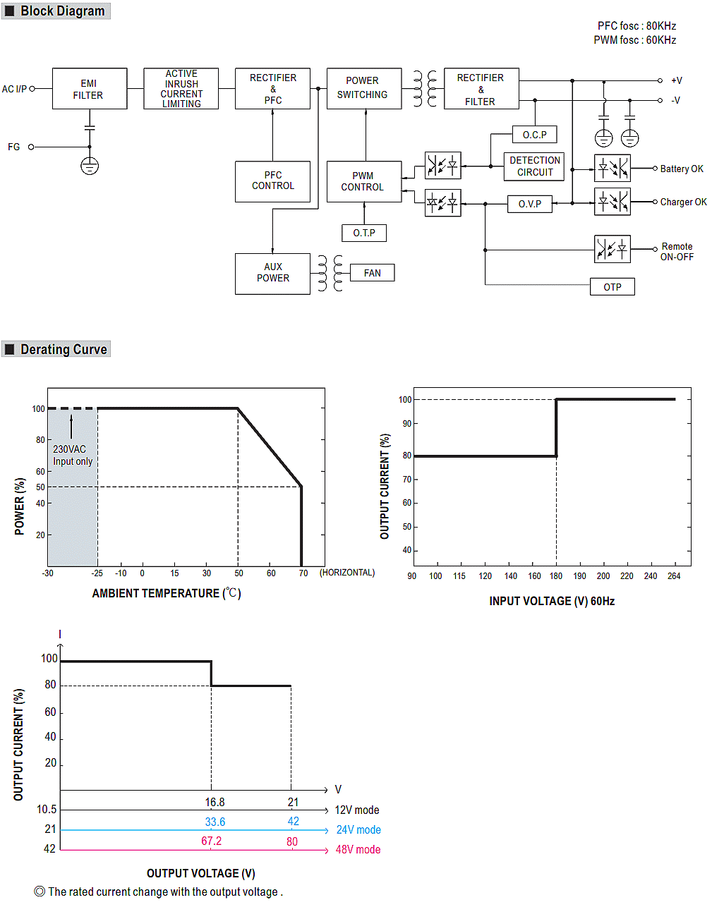 ◎ 其他特點包含:超寬壓輸出,透過面板上 VR 可調輸出電壓 (10.5~21V、21~42V、42~80V) 及輸出電流 50~100%、內建智慧型溫控風扇,可減緩吵雜風扇聲並提高風扇與電源整機壽命、-30 ~ +70°C 寬溫操作,適用全球各地及不同安裝環境場合、內建遠端 ON / OFF 控制接點、透過資訊類 IEC/EN/UL62368-1 及家電類 EN60335-1/-2-29 雙領域安規認證,且內置多重智慧保護功能,使用安全有保障,是一款物超所值、安全、耐用的雙用途電源供應器