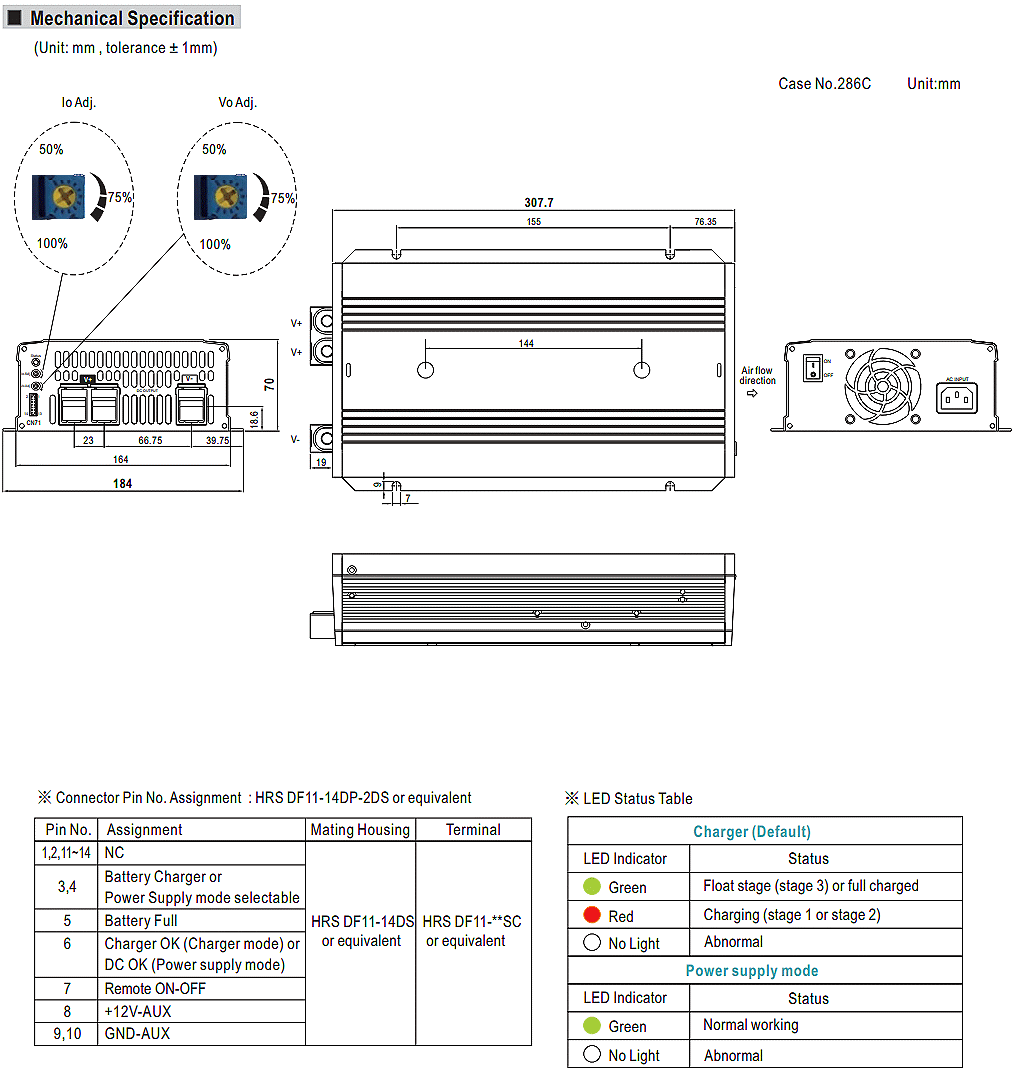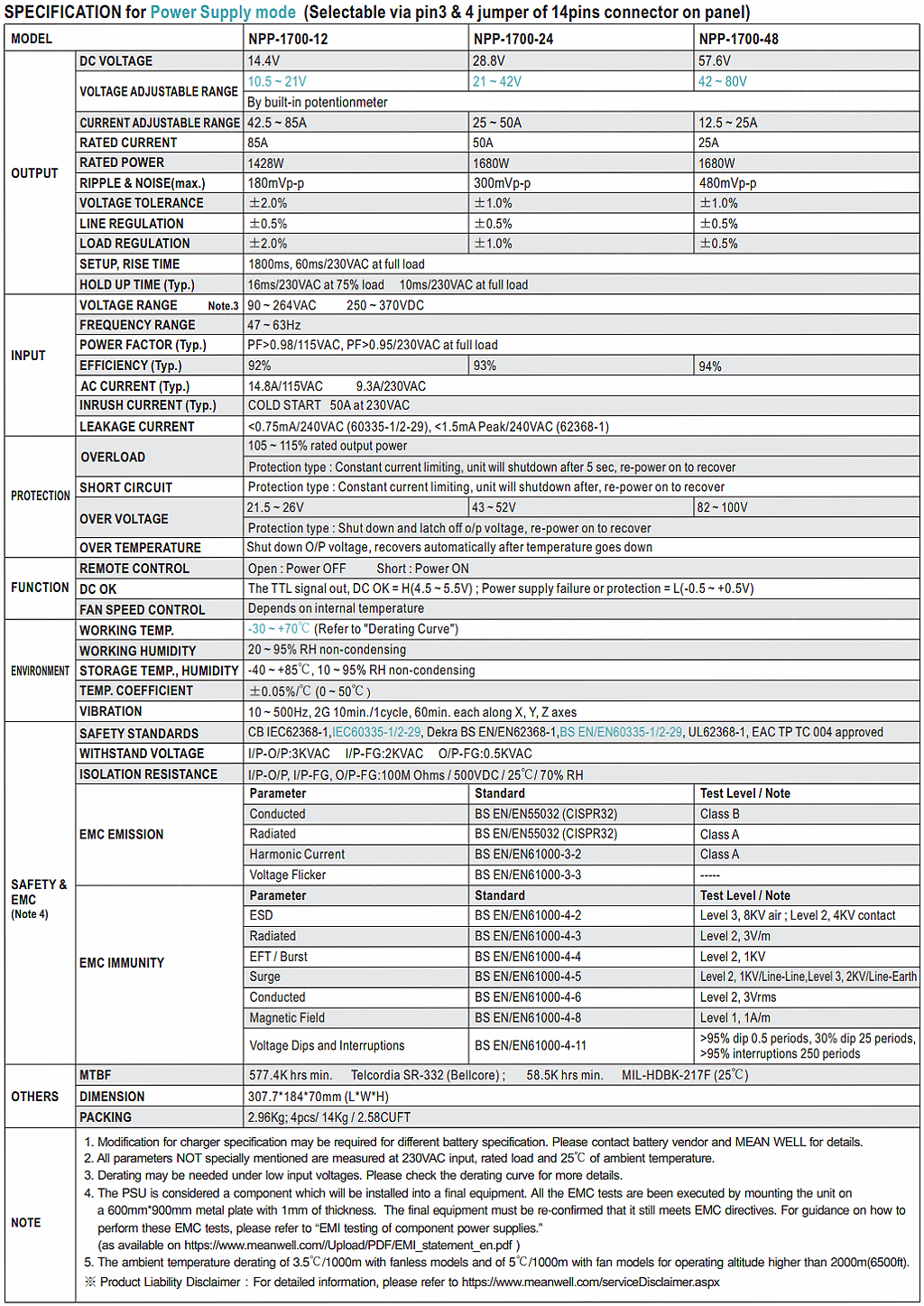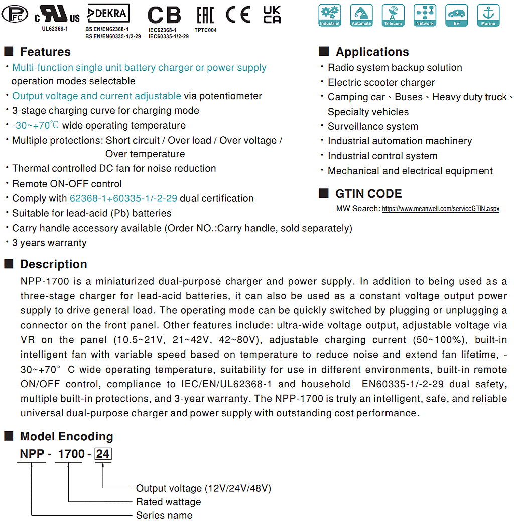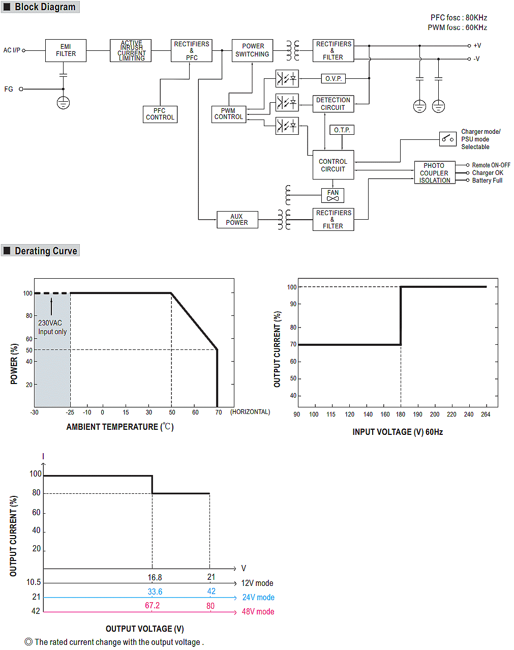 ◎ 其他特點包含:超寬壓輸出,透過面板上 VR 可調輸出電壓 (10.5~21V、21~42V、42~80V) 及輸出電流 50~100%、內建智慧型溫控風扇,可減緩吵雜風扇聲並提高風扇與電源整機壽命、-30 ~ +70°C 寬溫操作,適用全球各地及不同安裝環境場合、內建遠端 ON / OFF 控制接點、透過資訊類 IEC/EN/UL62368-1 及家電類 EN60335-1/-2-29 雙領域安規認證,且內置多重智慧保護功能,使用安全有保障,是一款物超所值、安全、耐用的雙用途電源供應器