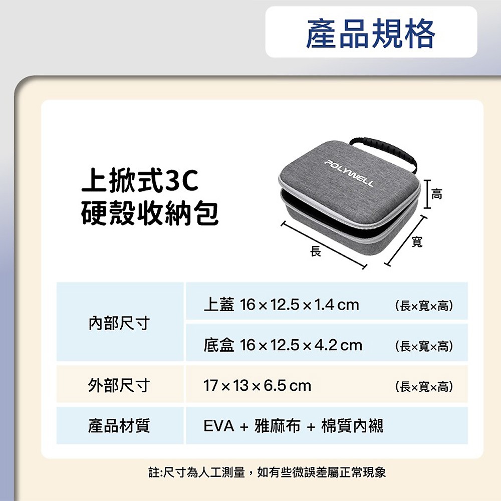 ◎ 加厚硬殼使用 EVA 材質,俱高韌性,抗衝擊性,同時隔熱防潮,保護您的3C產品
