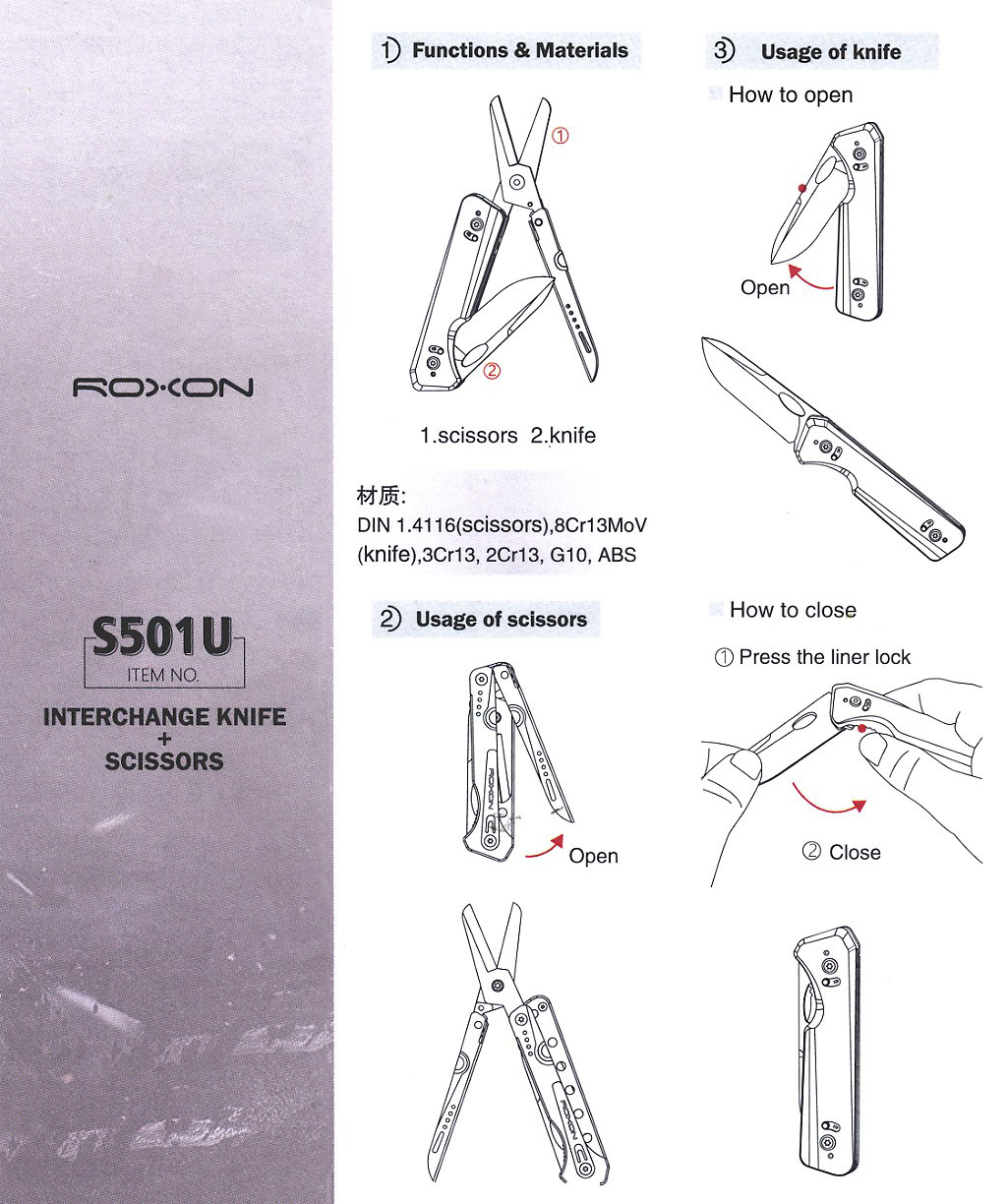 ◎ 材質:8Cr13MoV(Knife), DIN 1.4116(Scissors), 3Cr13,2Cr13,G10,ABS