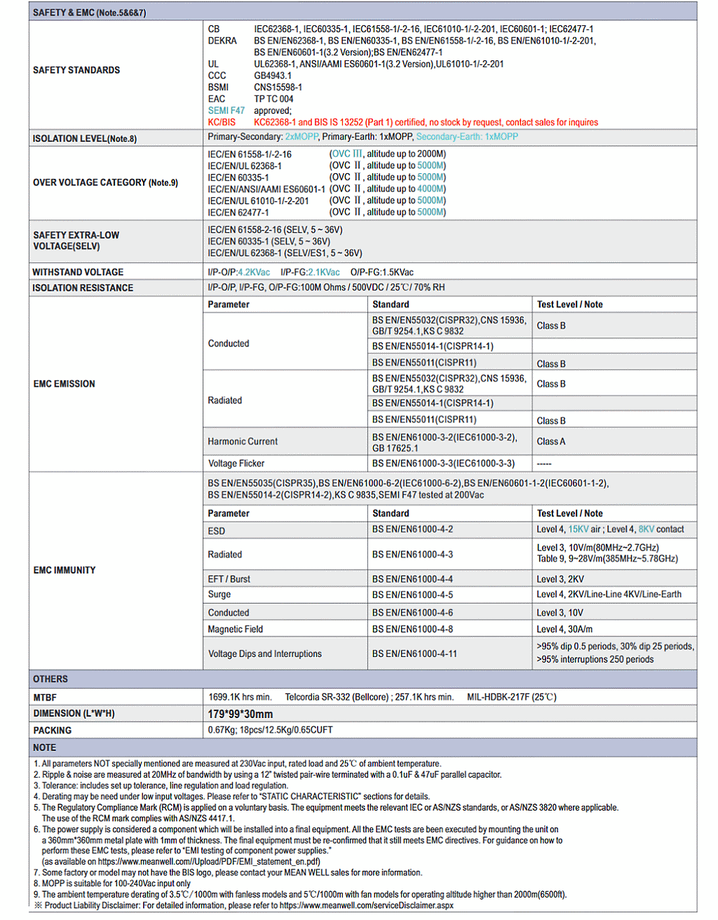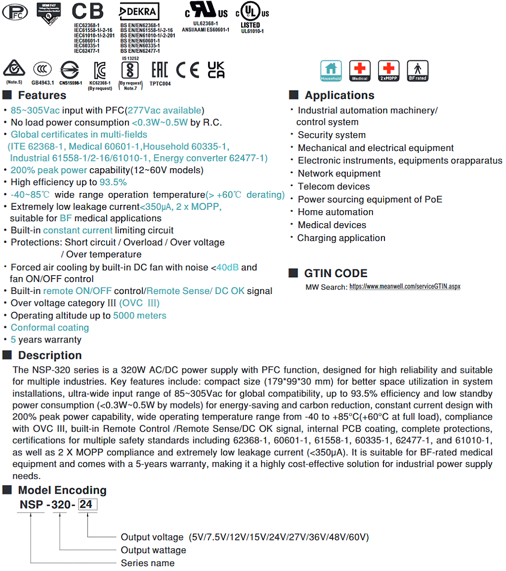 新世代 NSP 系列較於舊世代RSP系列,通過更多國標準及更多領域應用標準 (資通訊62368-1,醫療60601-1,家用 60335-1,工業61558-1/2-16/61010-1,能源轉換62477-1),不僅安全有保障,更提供市面罕見的5年長效保固,可靠耐用