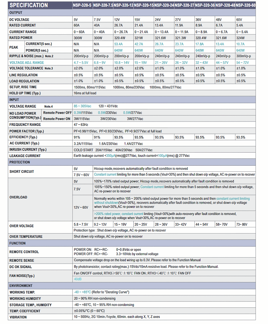 NSP系列提供 75W、100W、150W、200W、320W、500W、 750W、1000W、2400W多種功率選擇;以及5V、7.5V、12V、 15V、24V、27V、36V、48V、60V 多種輸出電壓,可滿足各類系統配置需求
