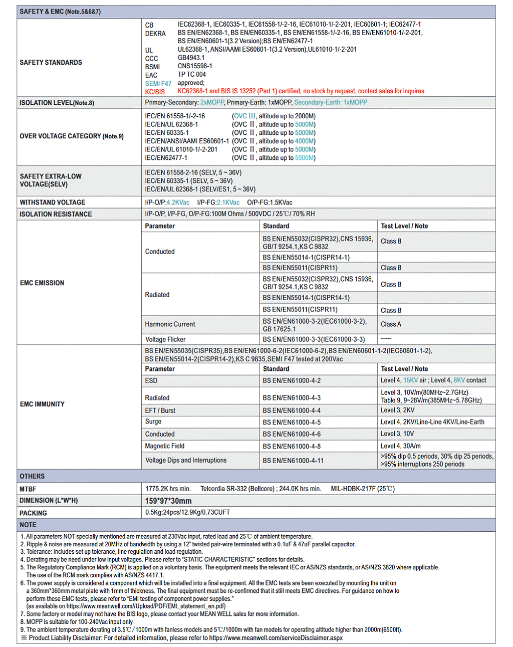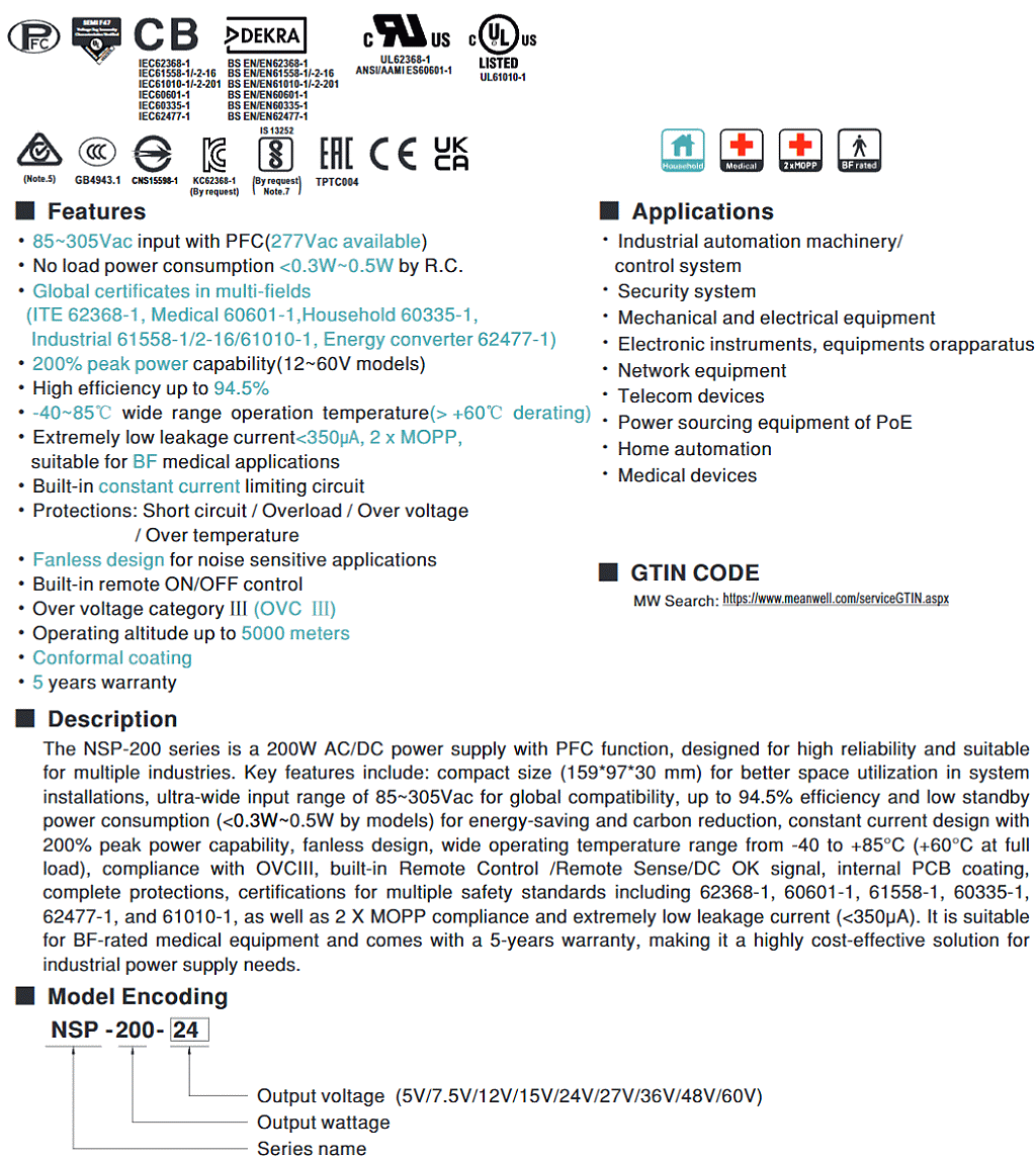 新世代 NSP 系列較於舊世代RSP系列,通過更多國標準及更多領域應用標準 (資通訊62368-1,醫療60601-1,家用 60335-1,工業61558-1/2-16/61010-1,能源轉換62477-1),不僅安全有保障,更提供市面罕見的5年長效保固,可靠耐用