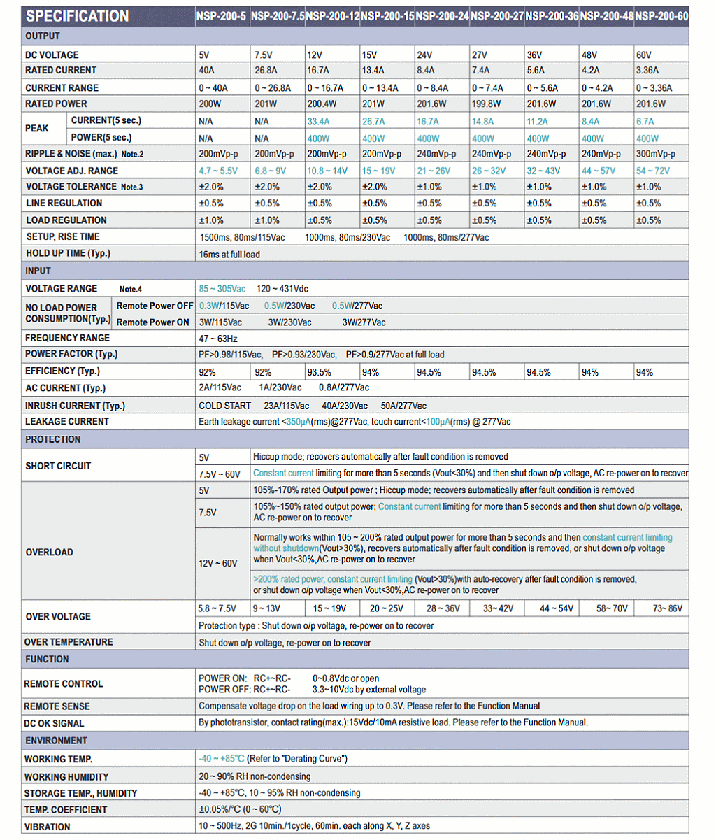 NSP系列提供 75W、100W、150W、200W、320W、500W、 750W、1000W、2400W多種功率選擇;以及5V、7.5V、12V、 15V、24V、27V、36V、48V、60V 多種輸出電壓,可滿足各類系統配置需求