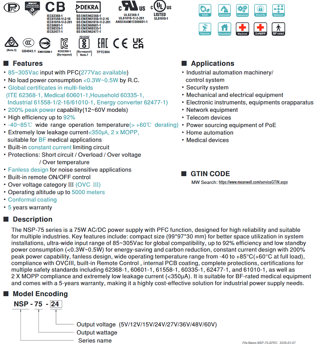 新世代 NSP 系列較於舊世代RSP系列,通過更多國標準及更多領域應用標準 (資通訊62368-1,醫療60601-1,家用 60335-1,工業61558-1/2-16/61010-1,能源轉換62477-1),不僅安全有保障,更提供市面罕見的5年長效保固,可靠耐用