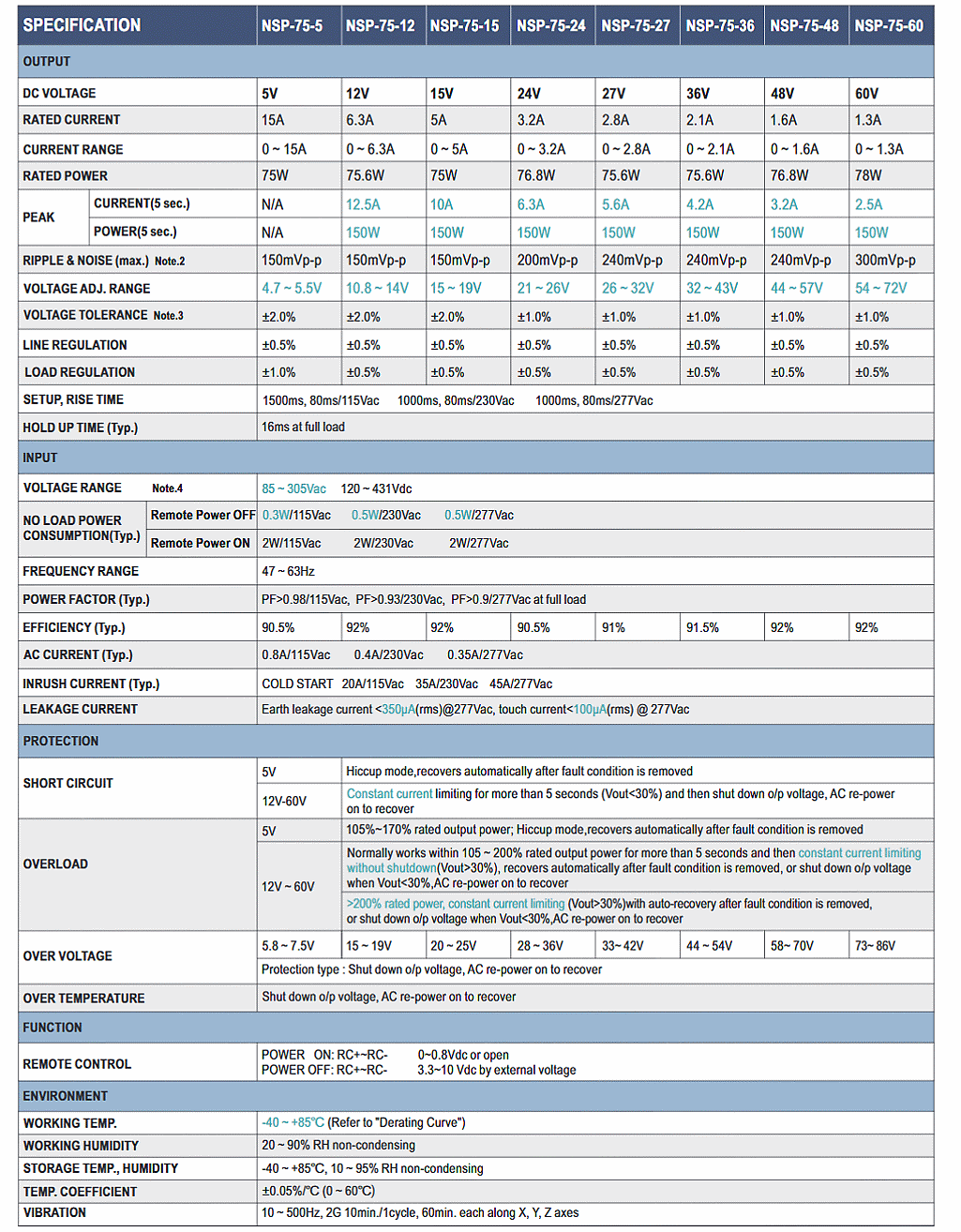 NSP系列提供 75W、100W、150W、200W、320W、500W、 750W、1000W、2400W多種功率選擇;以及5V、7.5V、12V、 15V、24V、27V、36V、48V、60V 多種輸出電壓,可滿足各類系統配置需求