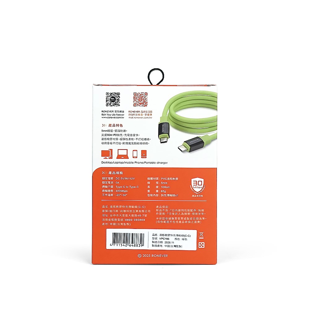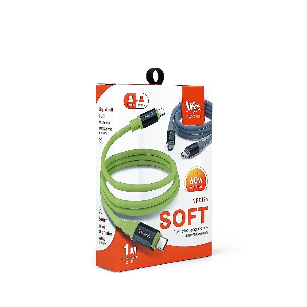 RONEVER 灰色 雙Type-C PD60W 防纏繞液態軟膠 快充傳輸線1M
