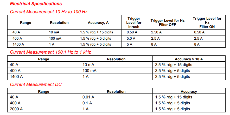 ◎ 電流測量:DC 和 AC,10 Hz 至 100 Hz