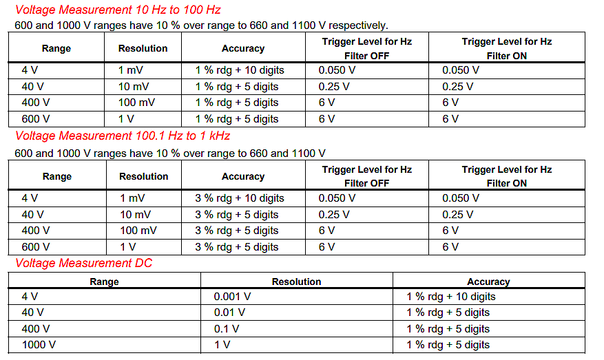 ◎ 電壓測量:AC,100.1 Hz 至 1 Hz(600 V 和 1000 V 範圍超出 10 %,分別可達 660 V 和 1100 V。)